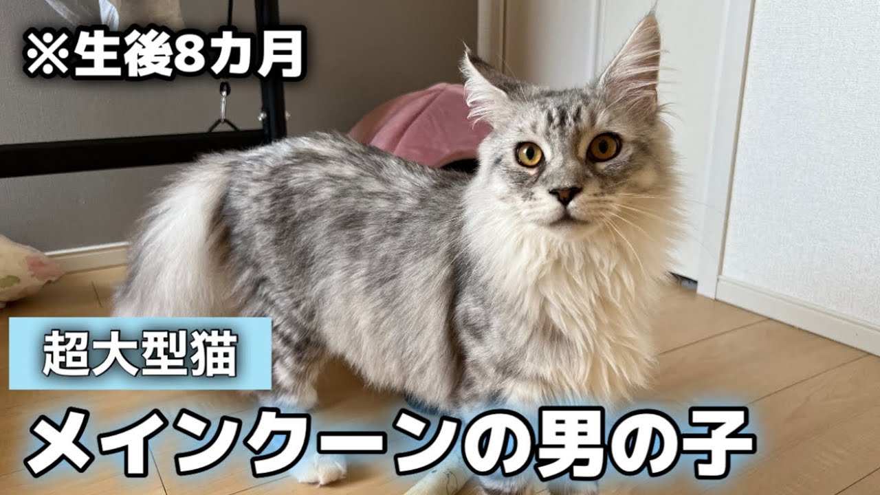 メインクーンは大型種なのでオスの成猫で6〜8kgが平均だそうです。10kg超の個体も珍しくないそうです。病院に連れて行くの大変だこりゃ。