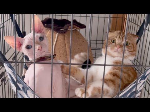 今日の動画は、無毛のスフィンクス猫と、折れ耳スコティッシュ猫のでこぼこコンビの、とある日の様子です。