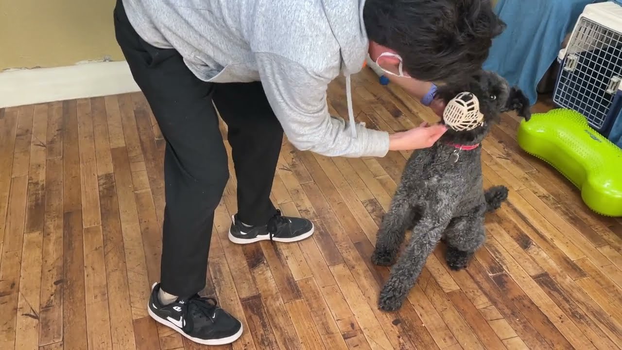 ケリーブルーテリアの”マーフィーくん”と”口輪を付ける練習”をしています!