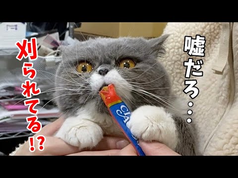 一心不乱にちゅーるを食べてる隙にバリカンで肉球のハミ毛をカットするのですが、ふとした瞬間我に返ってしまいます。