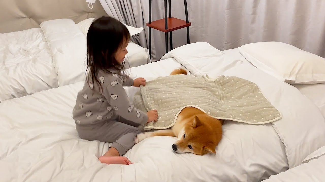 船を漕いで睡魔と戦いながら3歳娘の横でボディーガードの任務を全うする柴犬