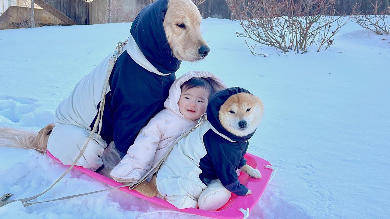 雪を全身で楽しんでるおからちゃんとうっちゃんいいね👍あらら3人でソリに乗ってる😂可愛い🥰