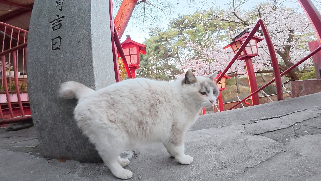 When you go inside the shrine to worship, a Shironeko tanuki cat navigates you to the other side but stops slightly in GOSHI GOSHI and then goes tokotoko, and it was so cute in nyannyanchororo, goro goro. 😊