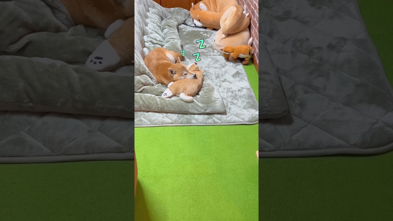 ママさんの「チビここで寝てたの?」に頷くチビちゃん可愛いね❤寝んねのポンさん柴ぬいぐるみが沢山でポンさんを探しました😂