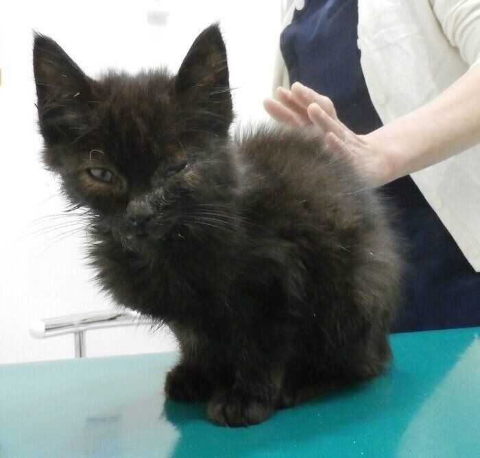 また、ノミ、ダニ、真菌症のためフケまみれで肌はボロボロ。左目は結膜炎で塞がり、右目の状態もよくないなど健康状態が悪かったため、そのまま入院することになったそうです。