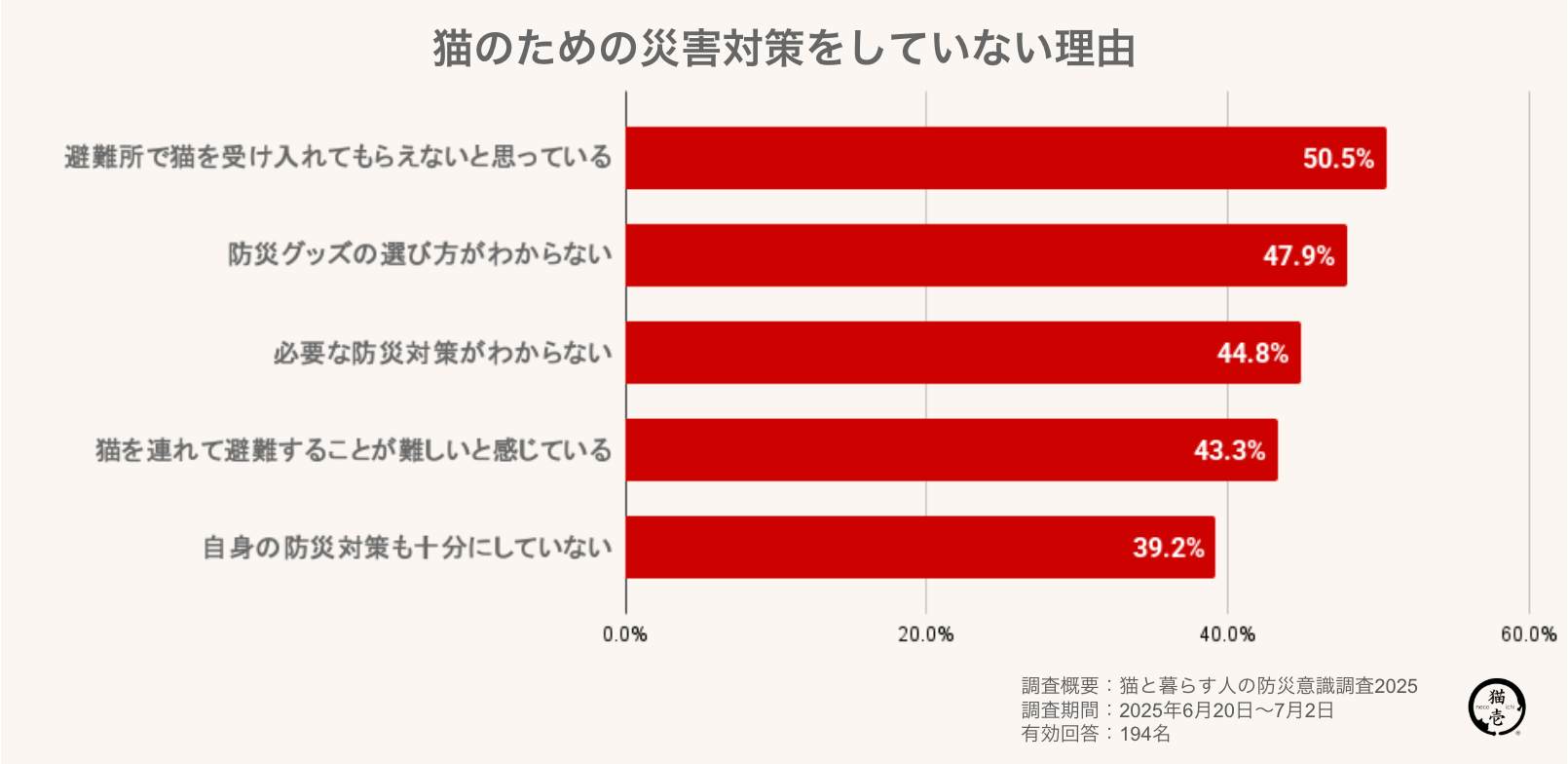 対策していない理由の最多は避難所で、猫を受け入れてもらえないと思っている(50.5%)次いで「防災グッズの選び方がわからない」(47.9%)、「必要な対策がわからない」(44.8%)など、情報不足や制度への不安が上位を占めました。