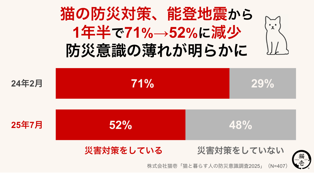 株式会社猫壱(本社:東京都新宿区)は、9月1日の「防災の日」に向けて、猫壱会員へ「猫との防災に関する調査」を実施しました。その結果、「猫のために防災対策をしている」と答えた人は52.3%にとどまり、昨年2月の調査(71%)と比べて約19ポイント減少していることがわかりました。2024年1月1日に発生した能登半島地震をきっかけに一時高まった防災意識が、1年半を経て薄れつつある実態が明らかになりました。