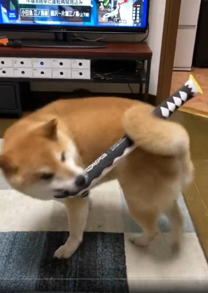 動画には尻尾で刀のおもちゃを挟み、目にも止まらぬ動きで口にくわえる様子が収められています。この華麗な動き、達人級。まさに「犬柱」と呼ぶにふさわしい身のこなしです。