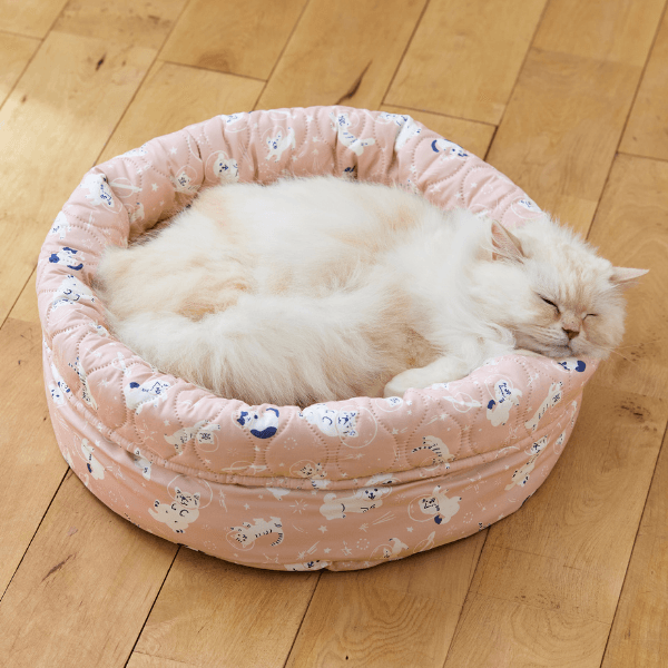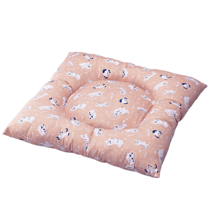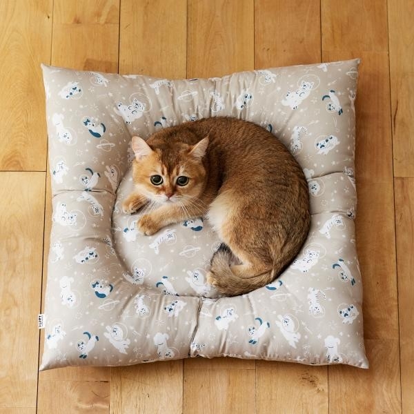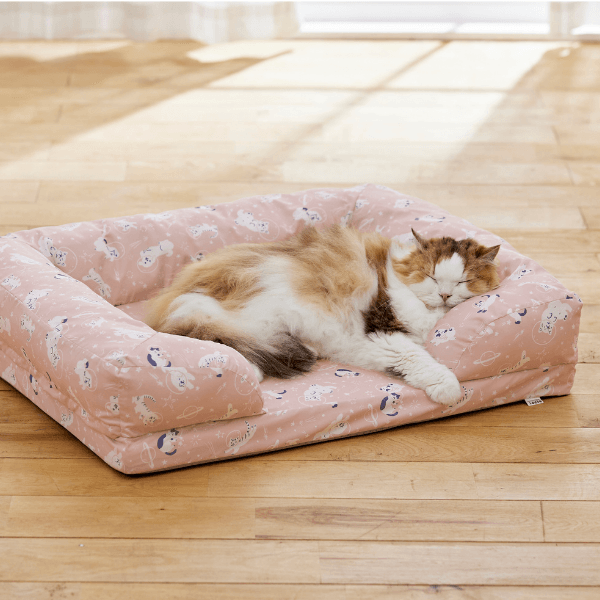 手洗いではなくご家庭にある洗濯機で洗うことにこだわった「洗える」シリーズは、糸と糸の隙間を小さくしたダウンプルーフ加工で犬猫の抜け毛が払いやすく、さらりとした肌触りで一年中快適にお過ごしいただけます。新発売の5アイテムは、2025年秋冬の新柄となる宇宙を漂う犬と猫のイラストが描かれたテキスタイルで、ベージュとピンクの2色展開です。