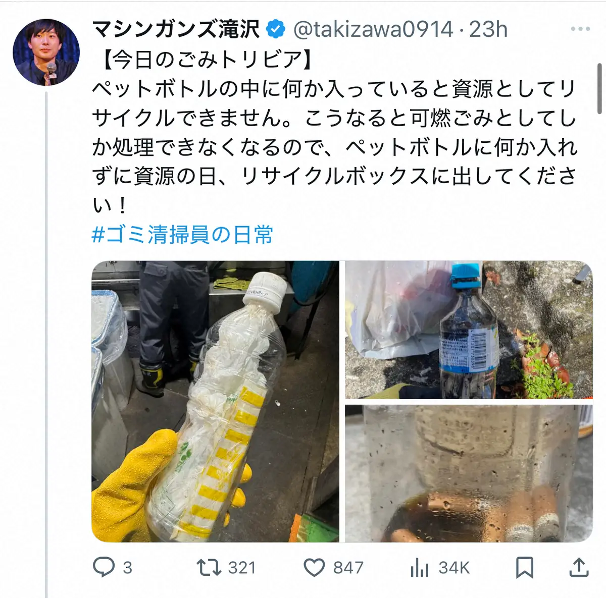 ごみ清掃員としても働くお笑いコンビ「マシンガンズ」の滝沢秀一(49)が3日までに自身のXを更新。ペットボトルを分別する際の注意点を指摘した。