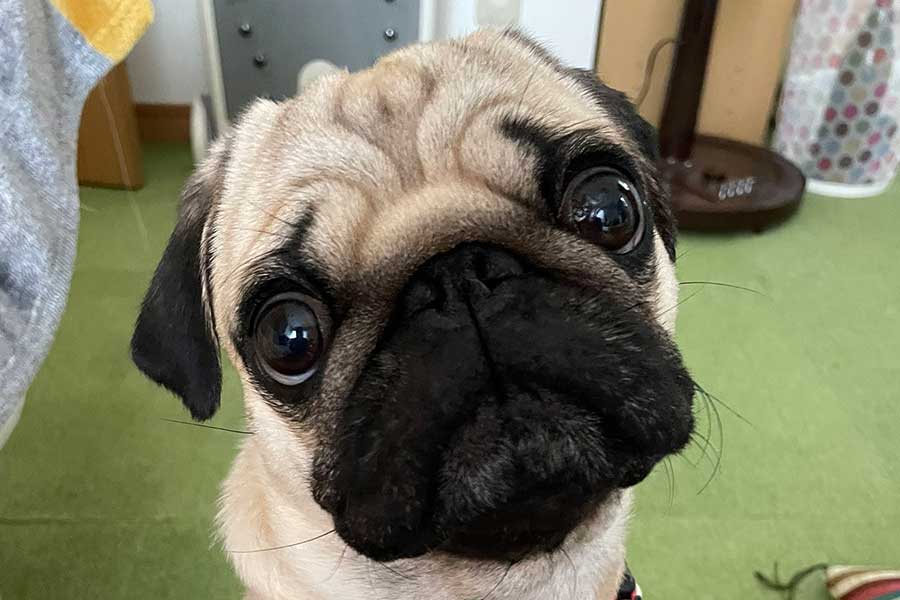 窓際で飼い主さんの帰りを待っていたのは、パグの「万咲(まんさく)」くん。2歳の男の子で、「人生に花と笑顔がいっぱい咲きますように」という願いを込めて名付けられました。素直で忠実、そして家族思いな万咲くんは、食いしん坊な一面も持っています。