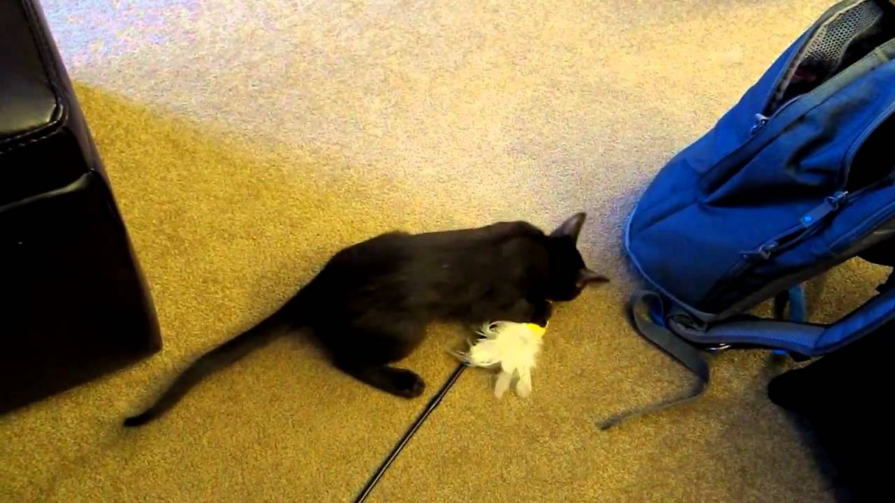 Jake, just over 4 months old in this video, a Havana Brown kitten, likes to fetch and carry things around in his mouth. He loves toys on wands so he hops up my desk, grabs it in his mouth and hops off! He also loved to rip the feathers off his toys.