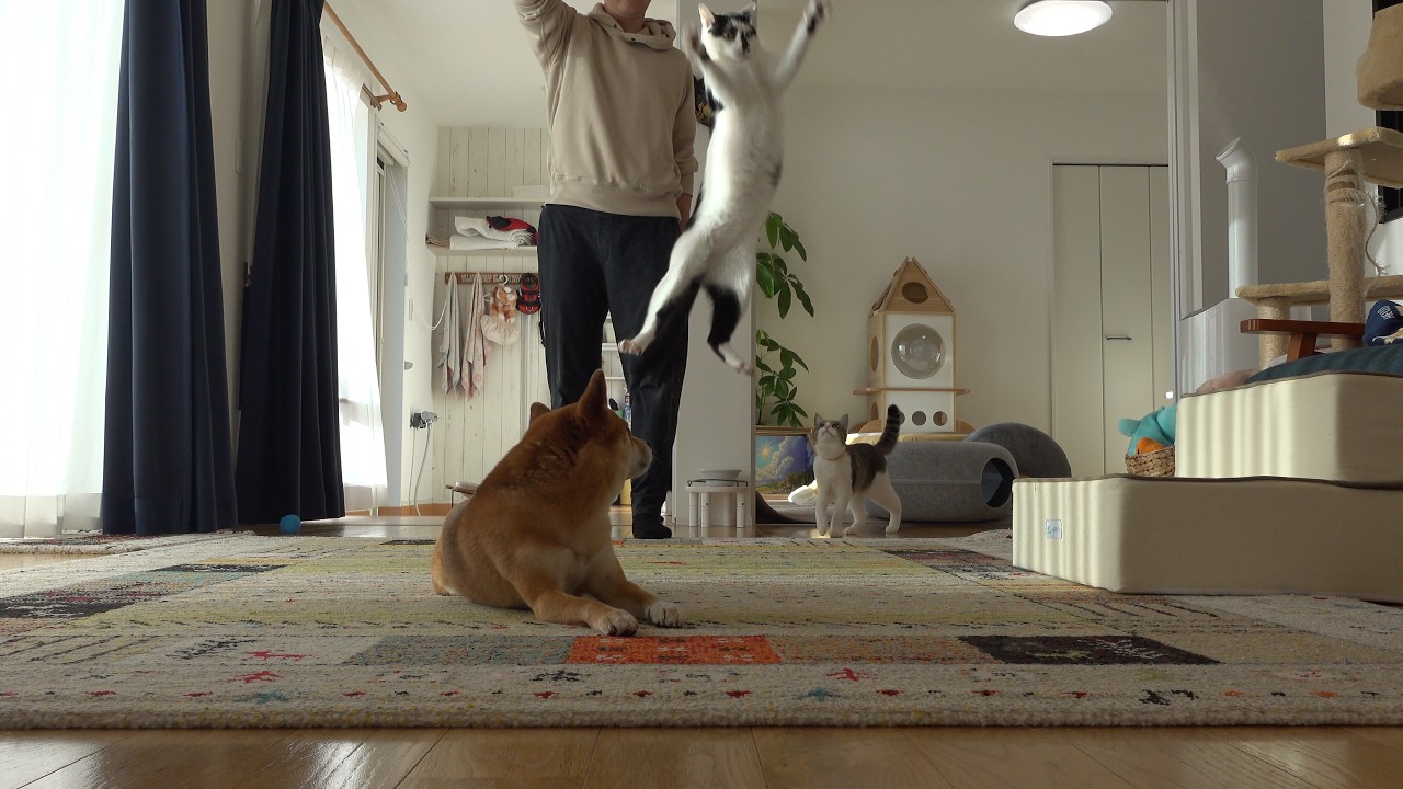 ごまちゃんの元へ行くいちごちゃん、ジャンプするしおくん、かわいいなぁ