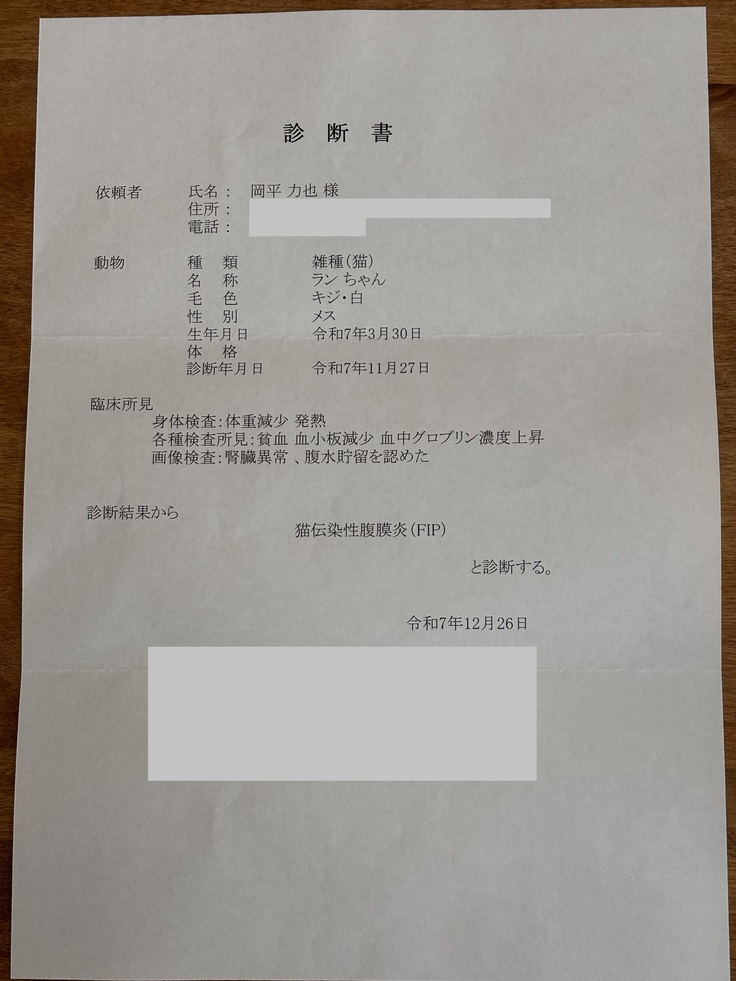 FIP(猫伝染性腹膜炎)と診断されました。