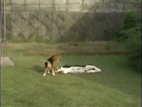 ビーグル犬とバセットハウンド犬との戦い?です。はたして勝者はどっちかナ?両者同い年です。