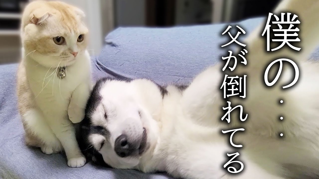 倒れたハスキー犬を心配して看病する子猫がこちら…