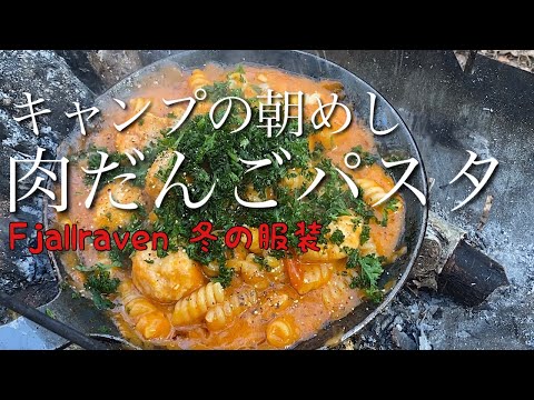 氷点下のキャンプの朝食。鍋用の肉だんごを焼いてパスタソースを使った
